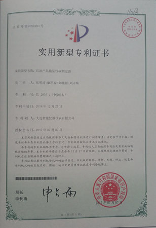 石油產(chǎn)品微量殘?zhí)繙y定器專利證書